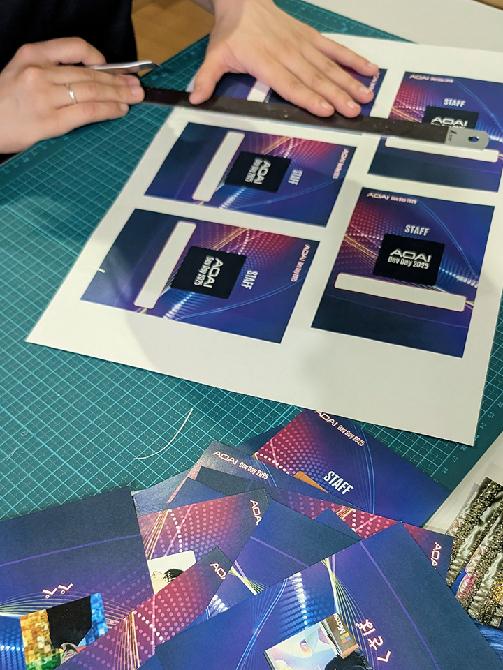 カット作業の様子 実際に付けていただくと、アバターや名前がオンラインツールで会話していた時と一致しやすく、初見でもすぐに認識できて大変わかりやすかったです。