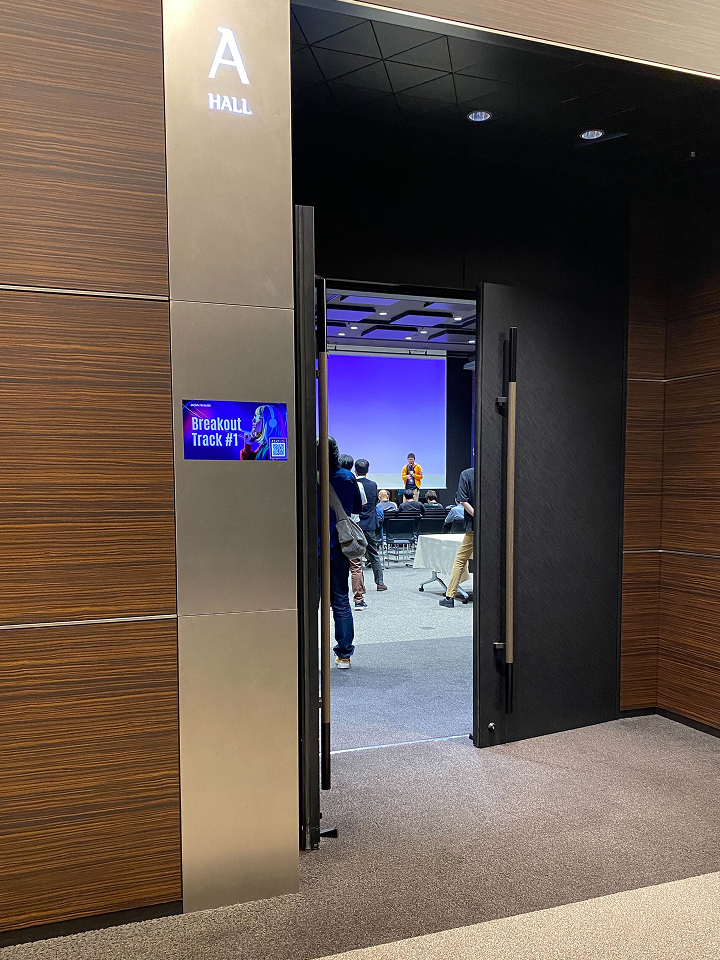 サイネージ 会場内の各部屋の入口付近には、トラック名とタイムテーブルに遷移するQRコードを表示したサイネージを設置しました。会場が混雑することを想定して、フォントサイズやQRコードを大きくすることで遠くからでも視認できるよう工夫しました。