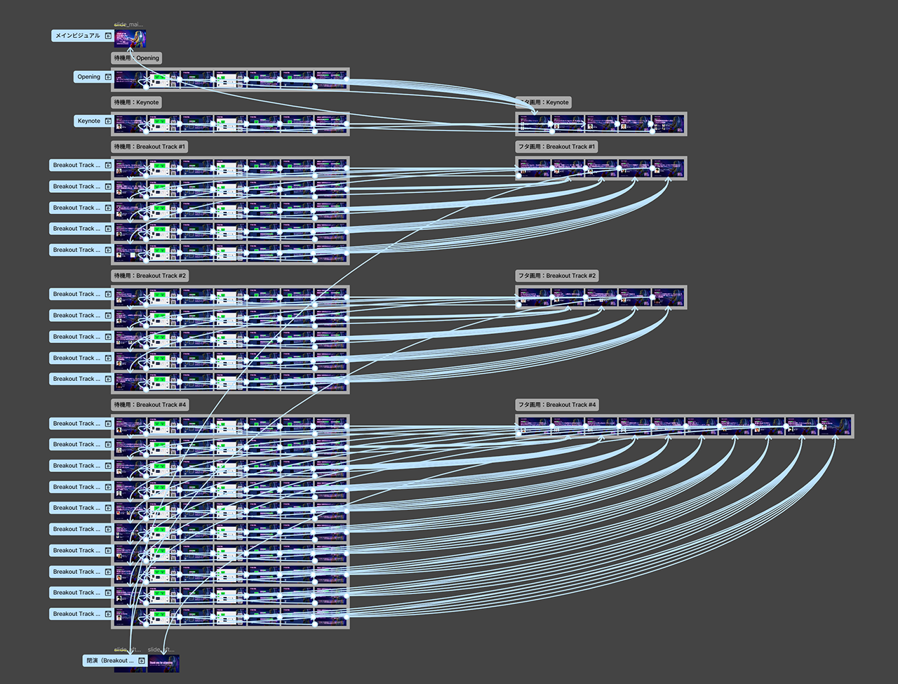 全体をプロトタイプでつなげたところ 本番当日はスタッフがPCでスライドを操作し、ほぼタイムテーブル通りに進行。トラブルもほぼなく、事前準備の成果が当日にしっかりと活かされました。