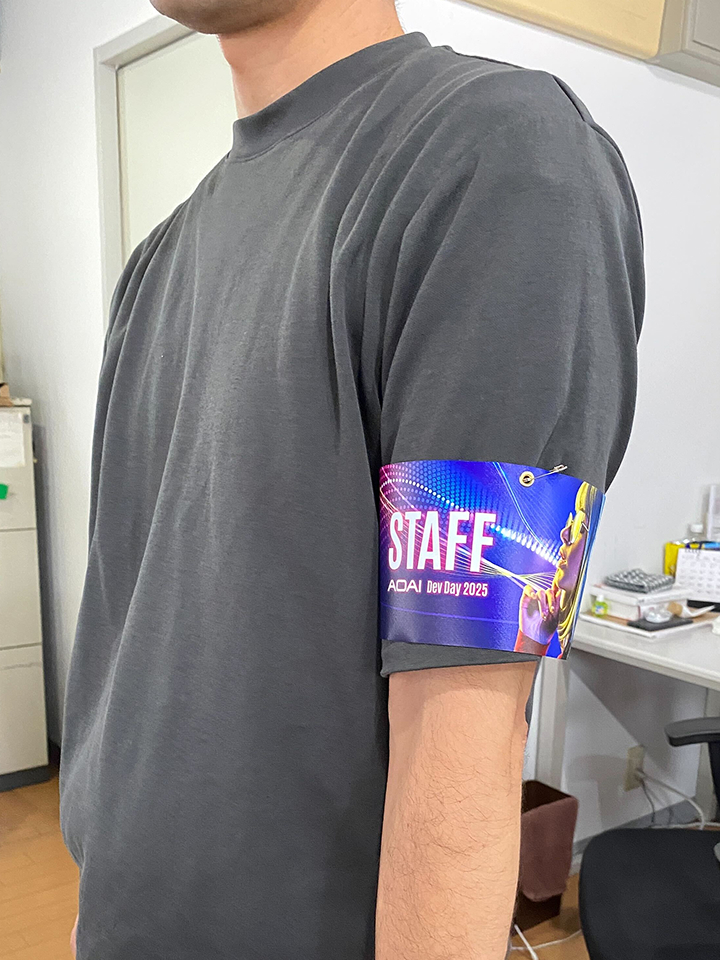 腕章 スタッフと来場者の違いを識別するため、Tシャツの代替として腕章を用意しました。キービジュアルのデザインをベースに、「STAFF」の文字を大きく配置した視認性の高いデザインとなっています。